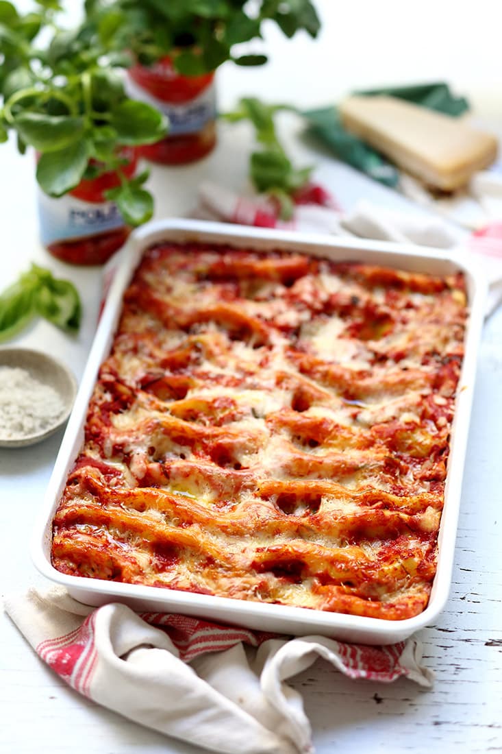 - מרכיבים את המנה- מניחים את דפי הפסטה בתחתית התבנית, מעליהן מניחים רבע מתבשיל הבשר ורבע מכמות הבשמל. מסדרים שכבה נוספת של פסטה וממשיכים באותו הסדר עד ליצירת 4 שכבות. מסיימים עם שכבת בשמל. מפזרים מוצרלה מגורדת וטימין.